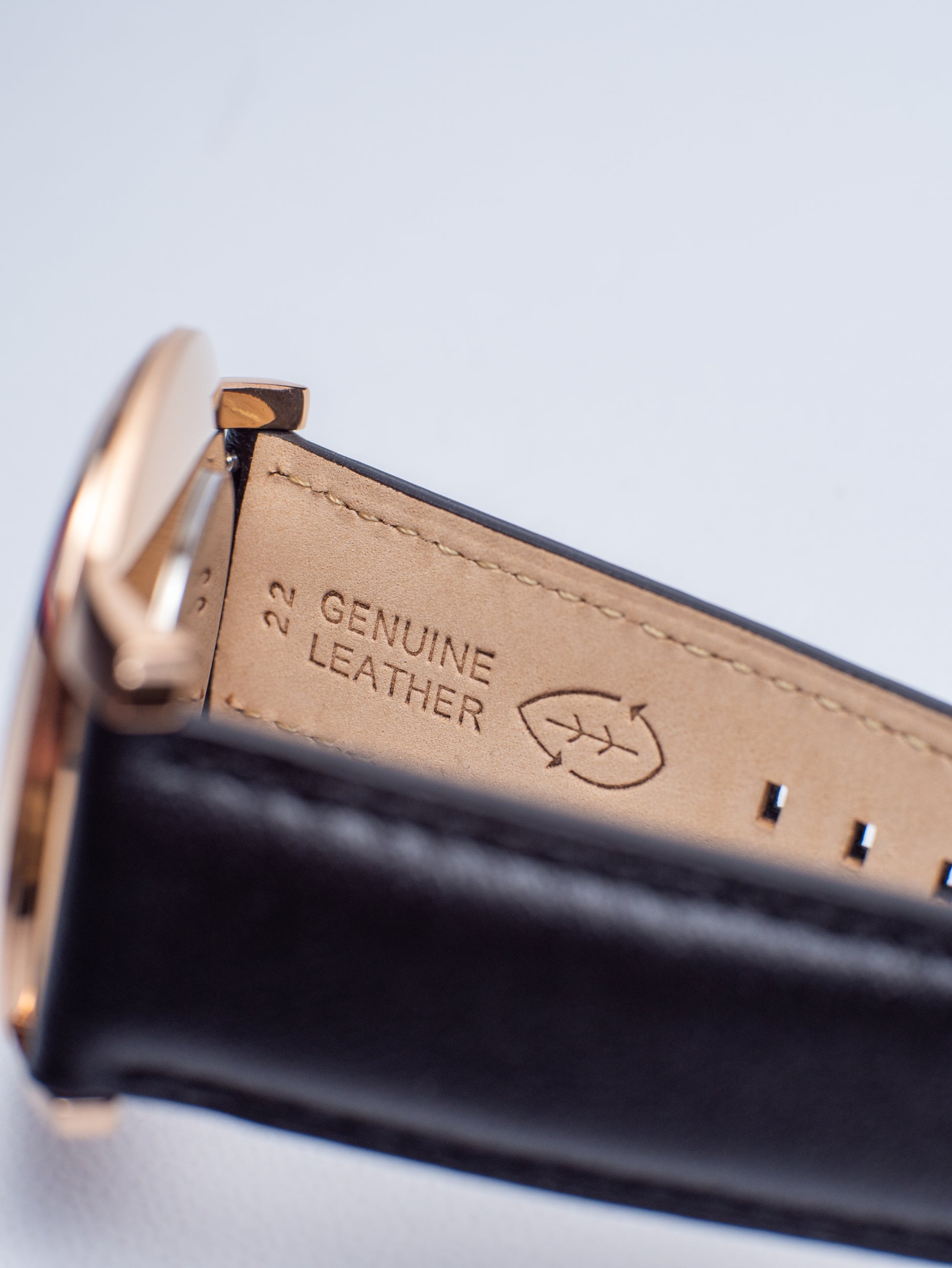 Correa de Piel Genuina: Banda de cuero negro de 22 mm que se adapta suavemente a la muñeca de usted, ganando flexibilidad con cada uso.