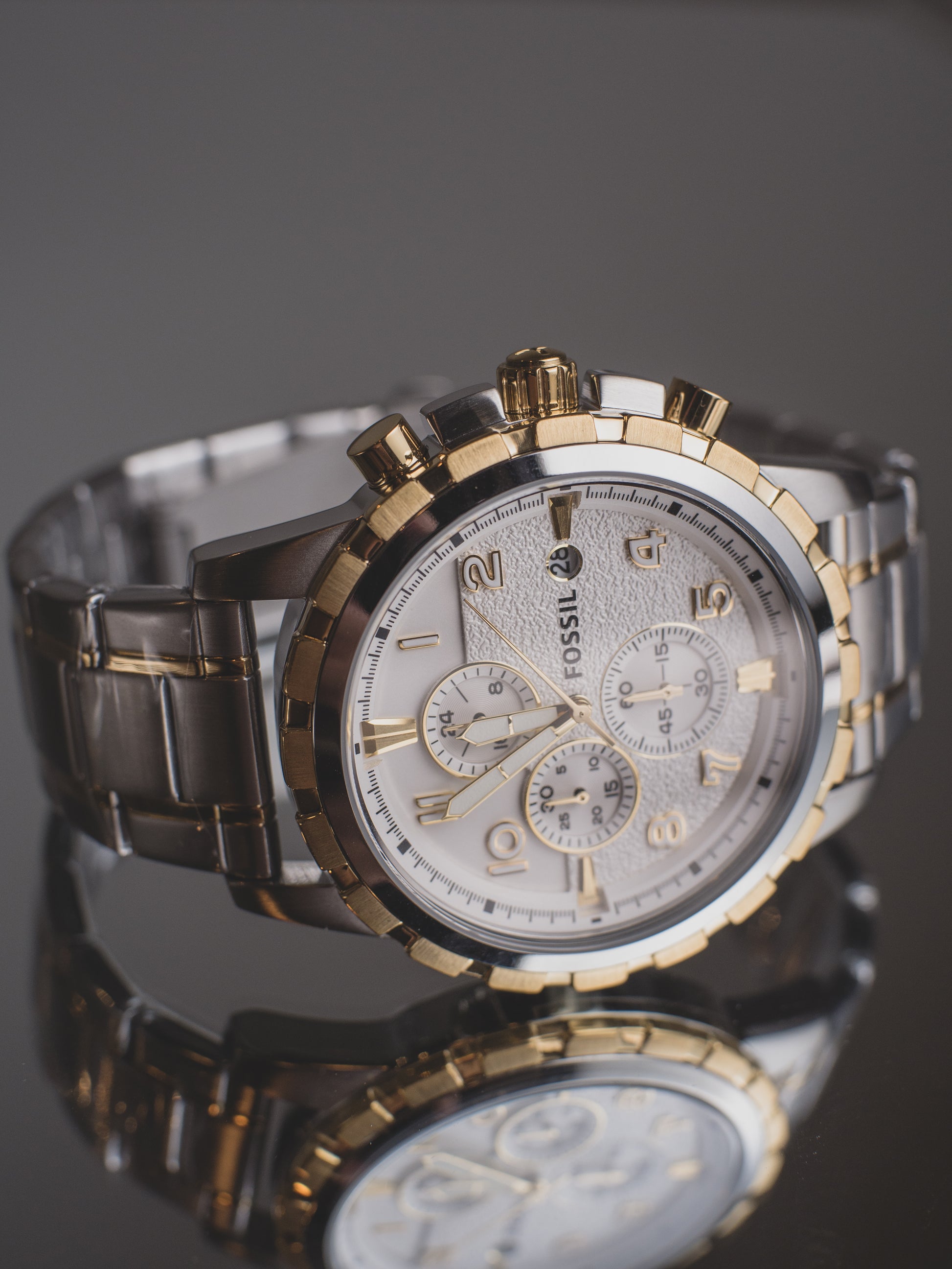 Inspirándose en el modernismo de mediados de siglo, las líneas limpias y la forma clásica de Dean producen un efecto sutil pero visualmente impactante. Con una caja de acero brillante y detalles en tono dorado, este reloj versátil puede acompañarte del día a la noche con facilidad. Este reloj Dean también cuenta con un movimiento de cronógrafo.Caja y movimiento: caja de 45 mm, ancho de banda de 22 mm, lente de cristal mineral endurecido resistente a rayones, movimiento de cuarzo preciso con pantalla analógica de cronógrafo y ventana de fecha, tres subesferas para rastrear minutos, segundos y tiempo de 24 horas, funcionalidad de cronómetro, importado.Esfera: Caja redonda de acero inoxidable bicolor plateado y dorado, con esfera plateada y detalles dorados.Correa del reloj: Correa de acero inoxidable duradera, de dos tonos, plateada y dorada, con cierre plegable seguro; los eslabones se pueden quitar para un ajuste personalizado; intercambiable con todas las correas Fossil de 22 mm.Resistente al agua: hasta 50 m (165 pies): se puede usar durante períodos cortos de natación recreativa y ducha, pero no para bucear o hacer snorkel; 5 ATM.