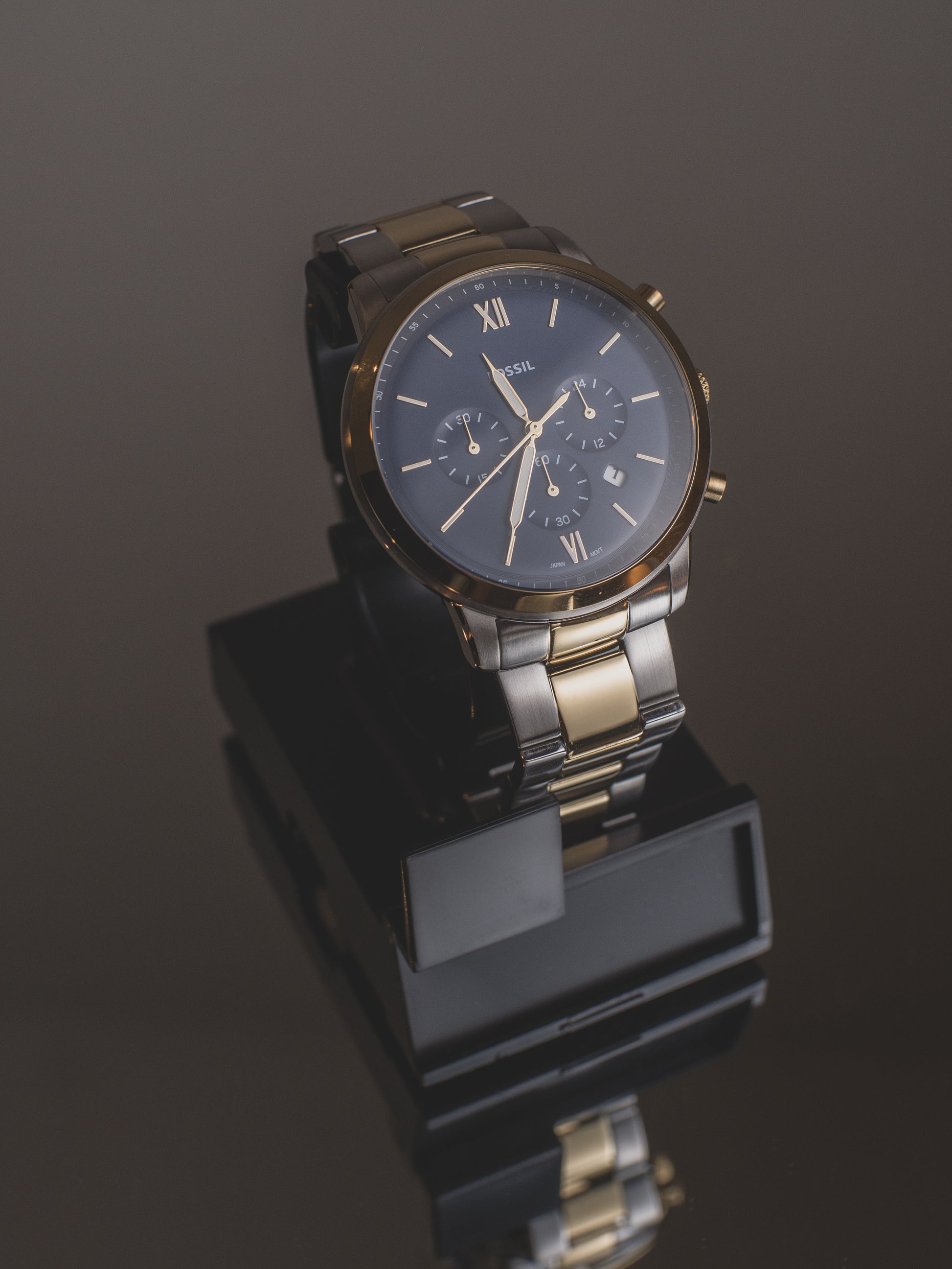 Caja de 44 mm, cristal mineral, movimiento de cuarzo, pantalla de cronógrafo analógica, ancho de correa de 22 mm.Caja redonda de acero inoxidable con esfera azul.Correa de acero inoxidable bicolorResistente al agua hasta 50 m (164 pies): portátil para nadar en aguas poco profundas.