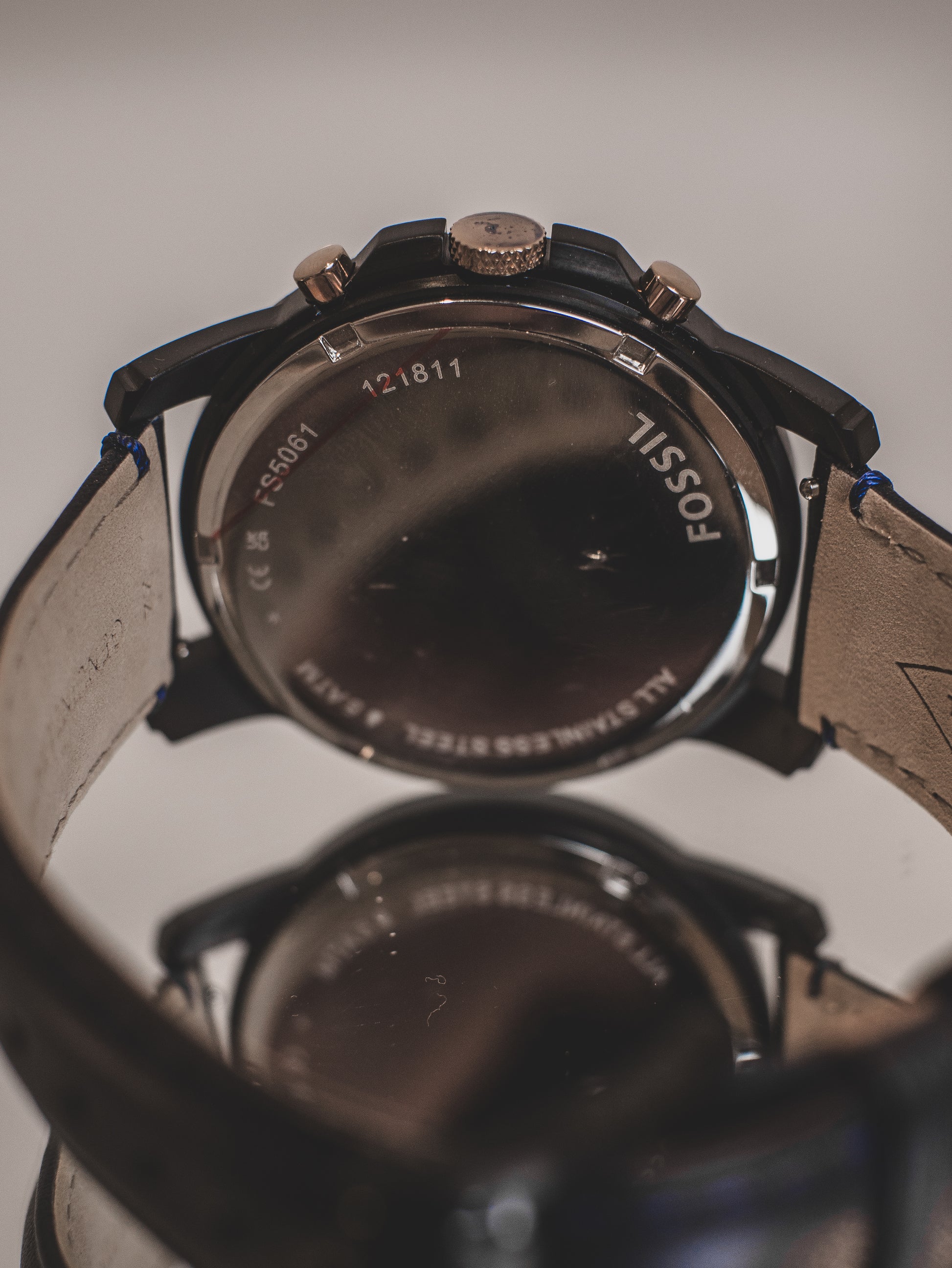 Esta temporada, el tradicional reloj Grant de cuero evoca una perspectiva soleada con detalles en azul brillante y rosa en la esfera. Con una caja negra brillante y un mecanismo de cronógrafo, es un favorito para la temporada. *Nuestros números romanos, inspirados en los relojes antiguos, están diseñados de manera única para brindar un equilibrio artístico a la esfera. Para crear una sensación de profundidad, también colocamos las subesferas sobre los números, lo que les da el efecto de estar cortados.Caja y movimiento: caja de 44 mm, ancho de banda de 22 mm, lente de cristal mineral endurecido resistente a rayones, movimiento de cuarzo preciso con pantalla analógica de cronógrafo y ventana de fecha, tres subesferas para rastrear minutos, segundos y tiempo de 24 horas, funcionalidad de cronómetro, importado.Esfera: Caja redonda de acero inoxidable negra, con esfera negra y azul marino y detalles en oro rosa.Correa del reloj: Correa de cuero genuino azul con cierre de hebilla ajustable seguro para un ajuste personalizado; intercambiable con todas las correas de reloj Fossil de 22 mm.Resistente al agua: hasta 50 m (165 pies): se puede usar durante períodos cortos de natación recreativa y ducha, pero no para bucear o hacer snorkel; 5 ATM.