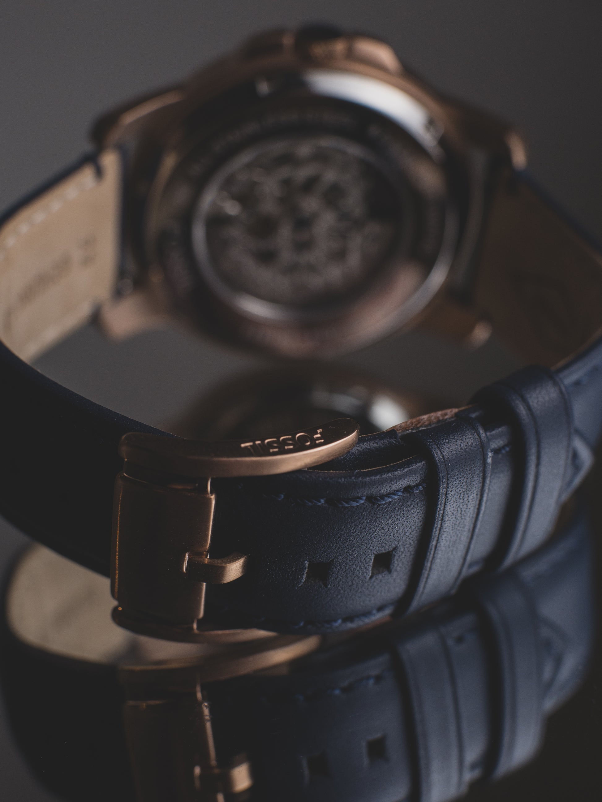 Caja de acero inoxidable en tono oro rosa con correa de piel azul. Bisel fijo en tono oro rosa. Esfera azul (centro esquelético) con manecillas luminosas en tono oro rosa y marcadores de hora en números romanos. Marcadores de minutos alrededor del borde exterior. Tipo de esfera: analógica. Manecillas luminiscentes. Subesfera de segundos sobre la posición de las 6 en punto. Movimiento automático. Cristal mineral resistente a los arañazos. Corona de tirar/presionar. Fondo de caja esquelético. Diámetro de la caja: 44 mm. Grosor de la caja: 13 mm. Forma de caja redonda. Ancho de banda: 22 mm. Cierre de espiga. Resistente al agua a 50 metros / 165 pies. Funciones: hora, minuto, segundo. Información adicional: apto para nadar y ducharse. Estilo de reloj casual.