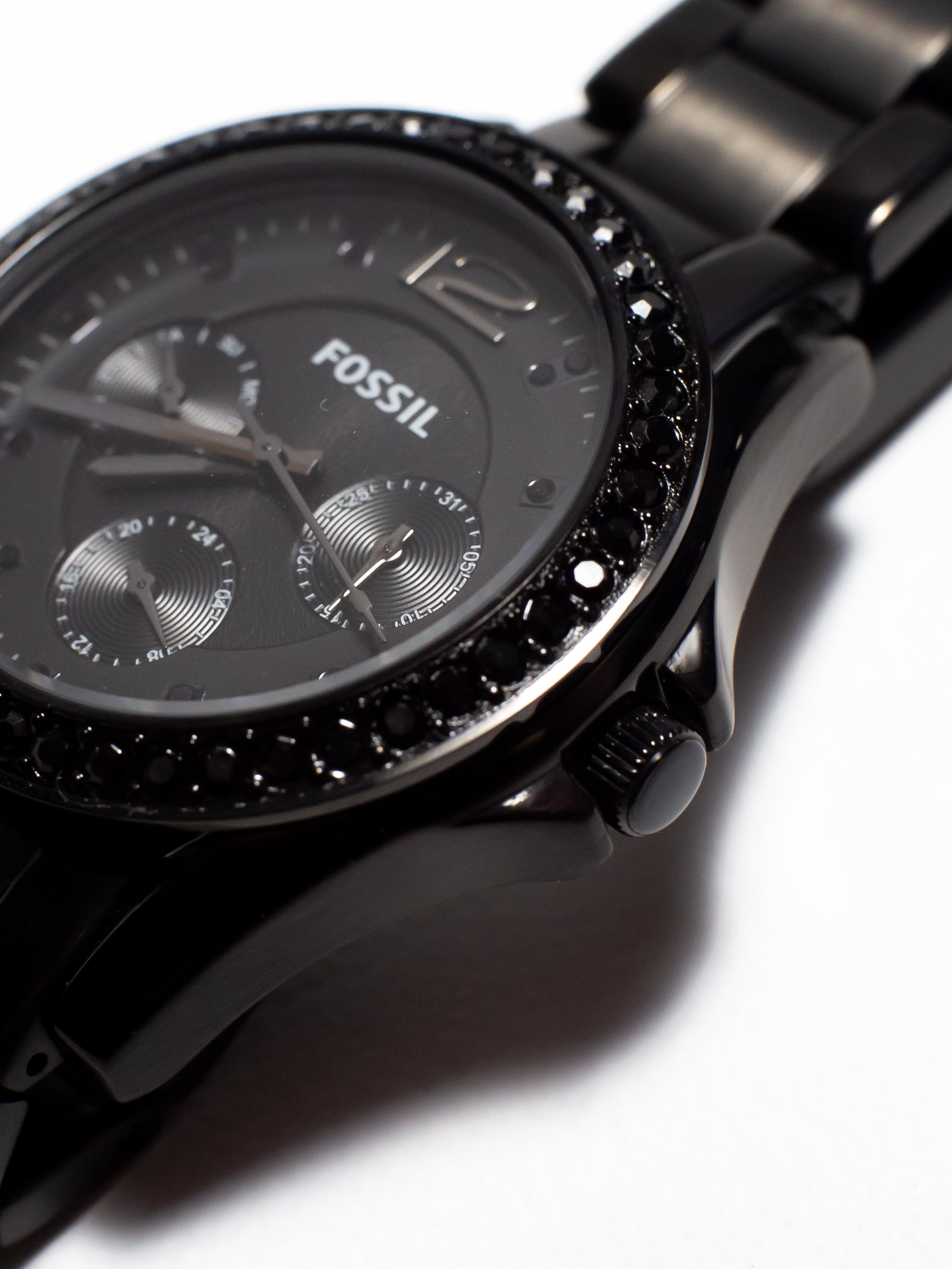 Brillo sutil y elegancia en cada segundo. El Fossil Riley es la combinación perfecta entre un diseño deportivo y detalles glamurosos. Con su característico bisel adornado con cristales "glitz" y su acabado total en acero inoxidable negro, este reloj es una pieza versátil que añade un toque de lujo moderno a cualquier atuendo de usted.