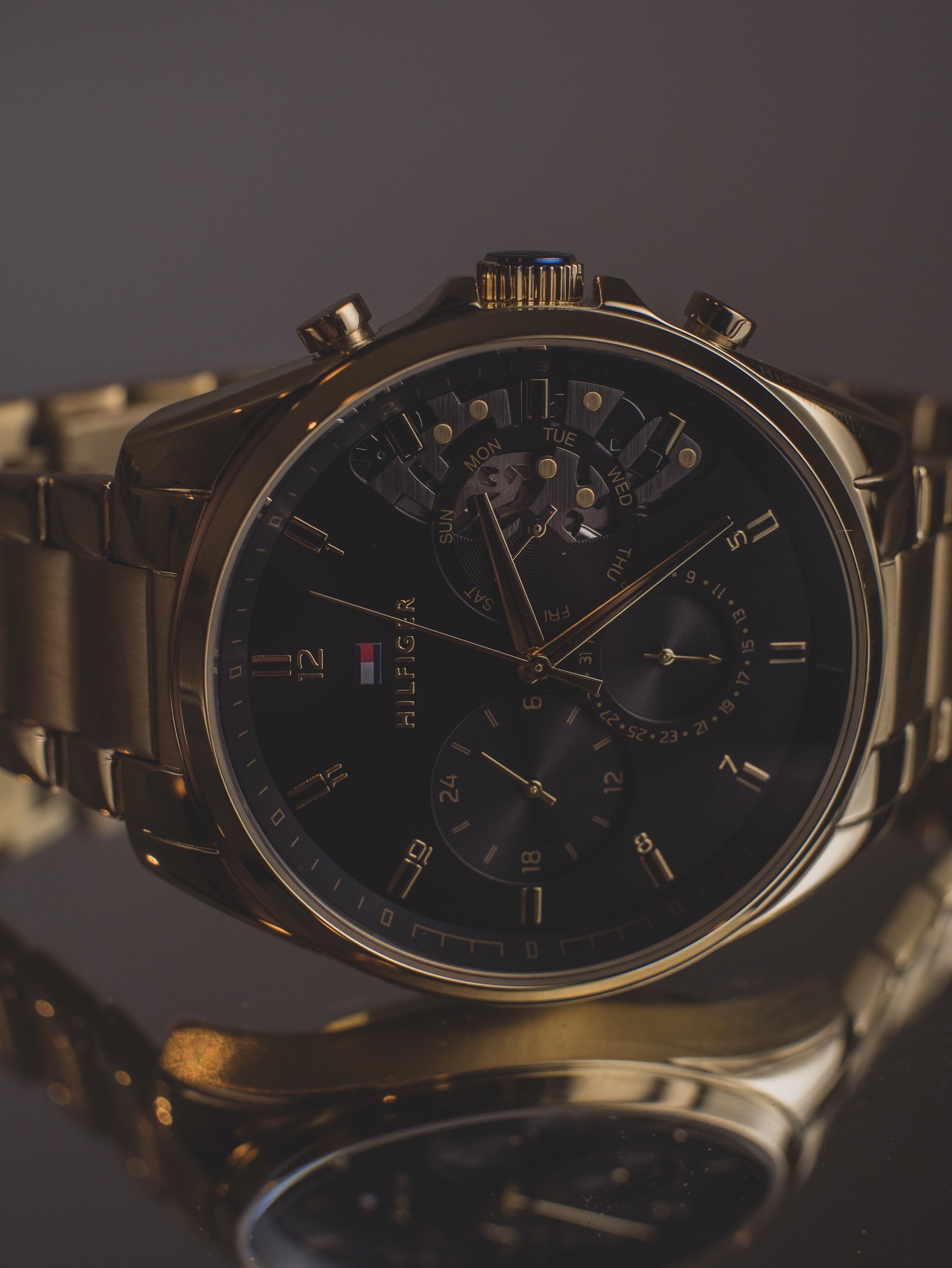 Movimiento multifunción de cuarzoGrosor de la caja de 10,25 mm, Diámetro de la caja: 43.5 mmEsfera negra con efecto de rayo de solPulsera de acero inoxidable con chapado iónico oro dorado5 ATM de resistencia al agua Se puede utilizar en la ducha o para nadar, pero no para bucear en aguas profundas.